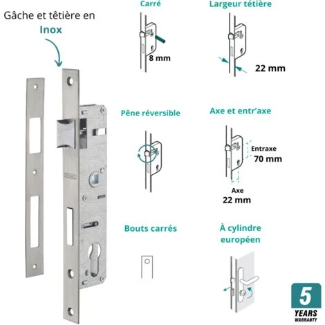 Serrure à encastrer à cylindre axe 21 ou 22 réversible