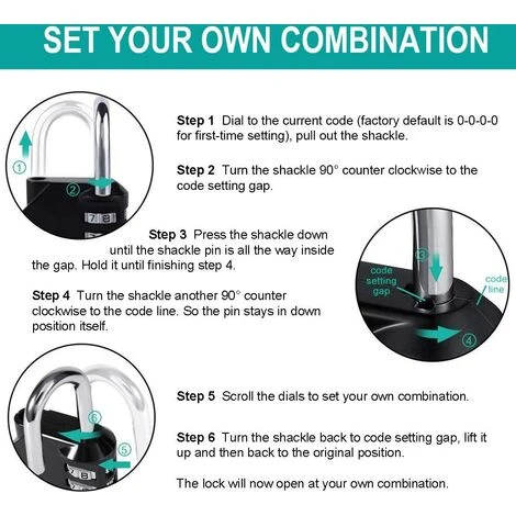 Remarque : Veuillez vous souvenir ou prendre une photo le numéro de code que vous avez défini Avant d’ouvrir le verrou, le nombre doit être bien aligné avec la ligne d’échelle Lorsque vous définissez le mot de passe, l’anse doit être pressé à la fin complètement.