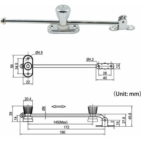 Dimensions du produit : longueur du verrou de fenêtre : 19 cm – Diamètre de la barre : 6 mm – Largeur de la plaque de montage : 50 mm/40 mm – Diamètre du bouton : 20 mm – Distance de glissement maximale : 14 cm – Poids : 120 g.