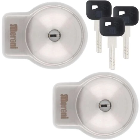 Le lot de 2 serrures UFO PLUS possède des matériaux haute résistance, une calotte en acier inoxydable et 3 clés plates.