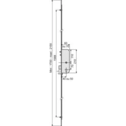 En acier zingué. Coffre de : 210 x 70 x 13 mm (axe à 50 mm) ou 210 x 60 x 13 mm (axe à 40 mm). Têtière de 2150 x 18 x 2,5 mm recoupable. Fouillot de 7 mm, axe à 1045 mm du sol. Entraxe : 70 mm. Condamnation des 3 points de verrouillage par la béquille ou par claquement de la porte. Relèvement possible de la poignée à 90° permettant l’ouverture d’un châssis vitré. Pêne dormant en acier, à 1 tour de clé. Descente forcée des galets par relevage de la béquille. Rouleaux réglables. Main universelle.