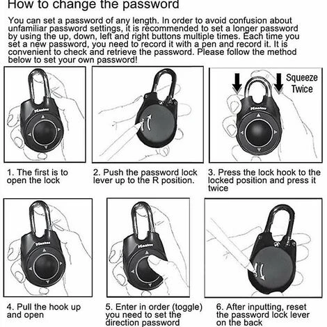 Définissez votre propre serrure à combinaison directionnelle pour un rappel rapide et facile de la combinaison. La combinaison peut être réinitialisée à n’importe quel nombre de mouvements dans n’importe quelle séquence. Le cadenas peut être ouvert d’une seule main sans rechercher la facilité d’utilisation.
