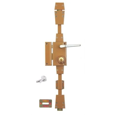 Boîtier en acier cambré ép. 20/10ème. Coffre cambré 75x130mm axe à 45 mm. Jeu de tringles pour une hauteur maximum de porte de 2,25 m. Mécanisme intérieur type équerre permettant la manœuvre du 1/2 tour de l’intérieur comme de l’extérieur avec la clé. Pêne et 1/2 tour en laiton massif. Pênes haut et bas en acier zingué. Gâche avec têtière de haute résistance. Enjoliveur de cylindre côté intérieur. Carré 7mm. Poignée double anodisé champagne fournie pour serrure à fouillot. Le montage de la serrure ne nécessite pas d’entaillage spécifique de la porte.
