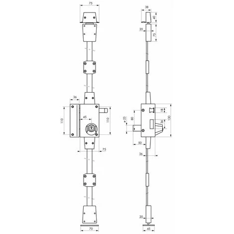 Boîtier en acier cambré ép. 20/10ème. Coffre cambré 75x130mm axe à 45 mm. Jeu de tringles pour une hauteur maximum de porte de 2,25 m. Mécanisme intérieur type équerre permettant la manœuvre du 1/2 tour de l’intérieur comme de l’extérieur avec la clé. Pêne et 1/2 tour en laiton massif. Pênes haut et bas en acier zingué. Gâche avec têtière de haute résistance. Enjoliveur de cylindre côté intérieur. Carré 7mm. Poignée double anodisé champagne fournie pour serrure à fouillot. Le montage de la serrure ne nécessite pas d’entaillage spécifique de la porte.