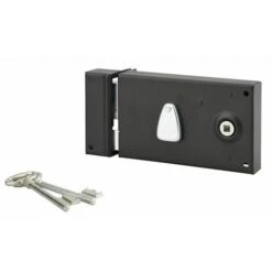Coffre et gâche acier cambré. Pêne et demi-tour acier. Revêtement anti-corrosion. Canon alliage long. 40 mm. Mécanisme à 4 gorges laiton 2 tours. 2 clés nickelées. 12 variures. Pêne 1/2 tour réversible pour porte ouvrant à l’extérieur. Carré 6 mm. Entrée de clé et de fouillot acier.