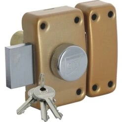 - Verrou à bouton City 25 avec coffre et gâche en acier embouti 15/10 ème et pêne en acier nickelé de 110 mm, finition : bronzé or.
