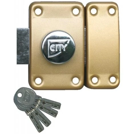 Pour huisserie bois. Coffre en acier embouti 15/10 de H 90 x l 56 mm avec pêne de 110 mm et gâche de H 90 x l 35 mm. Entraxes de fixation standard de la gamme City coffre H 70 x l 38 mm et gâche H 70 x l 19 mm. Peinture de protection intérieure. Cylindre de Ø 26 mm à 6 goupilles en laiton massif. Goupilles inox avec contre goupille anti-arrachement. 5 clés réversibles.